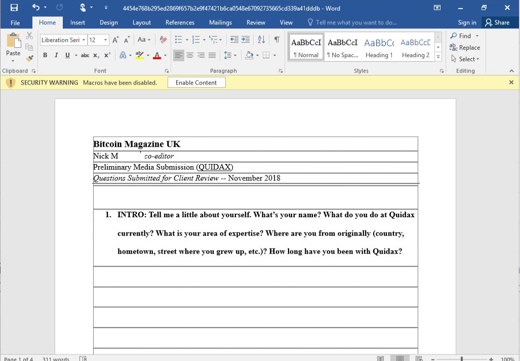 OSX.BadWord is a threat exploiting a Microsoft Word for Mac sandbox escape and delivering a Meterpreter payload. Like similar Word-based attacks on Windows, this leverages a VBA macro to execute code and infect the user. OSX.BadWord is distributed via an email to staff of the Quidax cryptocurrency platform, inviting them to contribute to “BitCoin Magazine UK”.