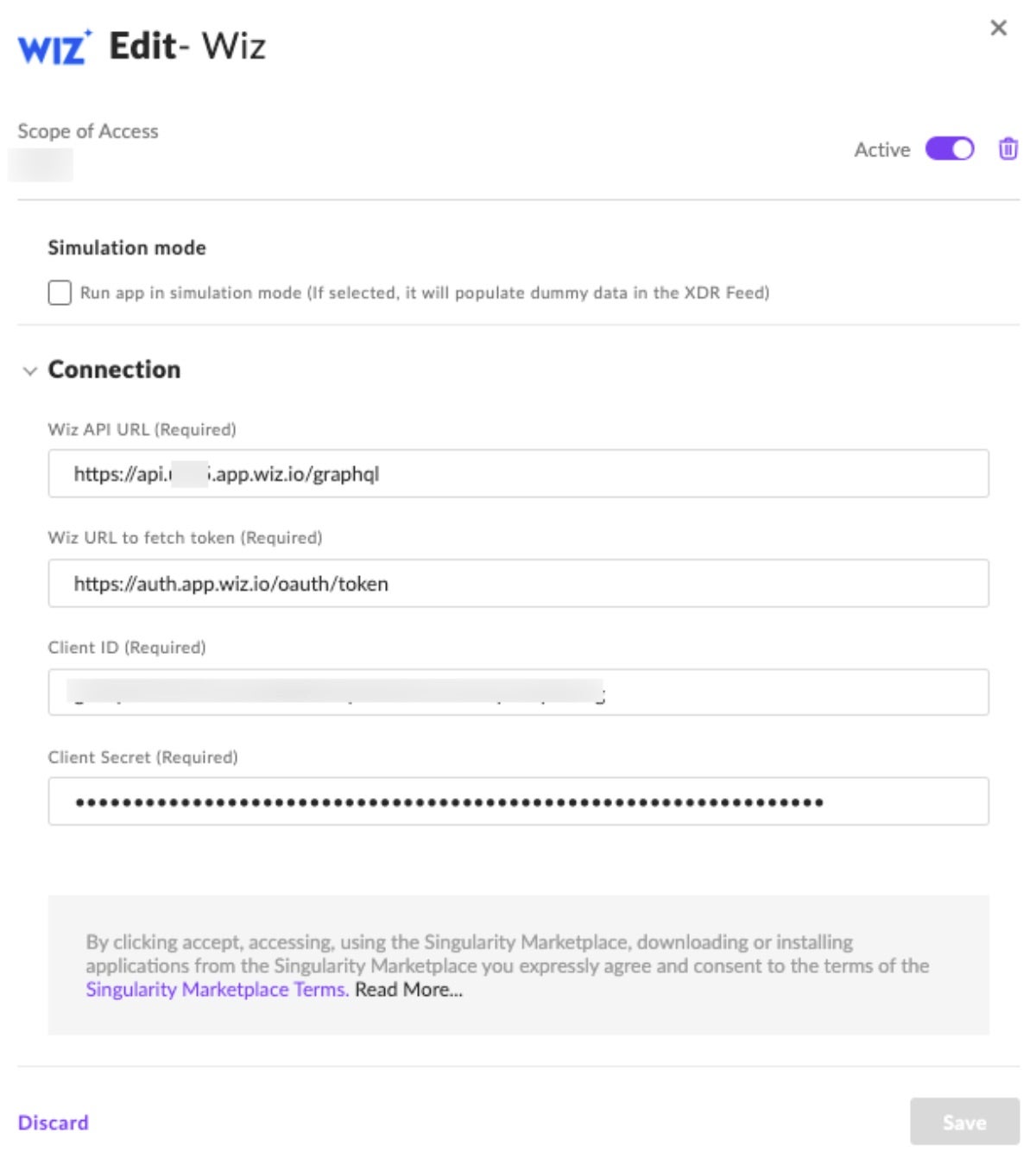 - Copy the value for “API Endpoint URL” and paste it into the “Wiz API URL” field of the Singularity Marketplace app for Wiz.