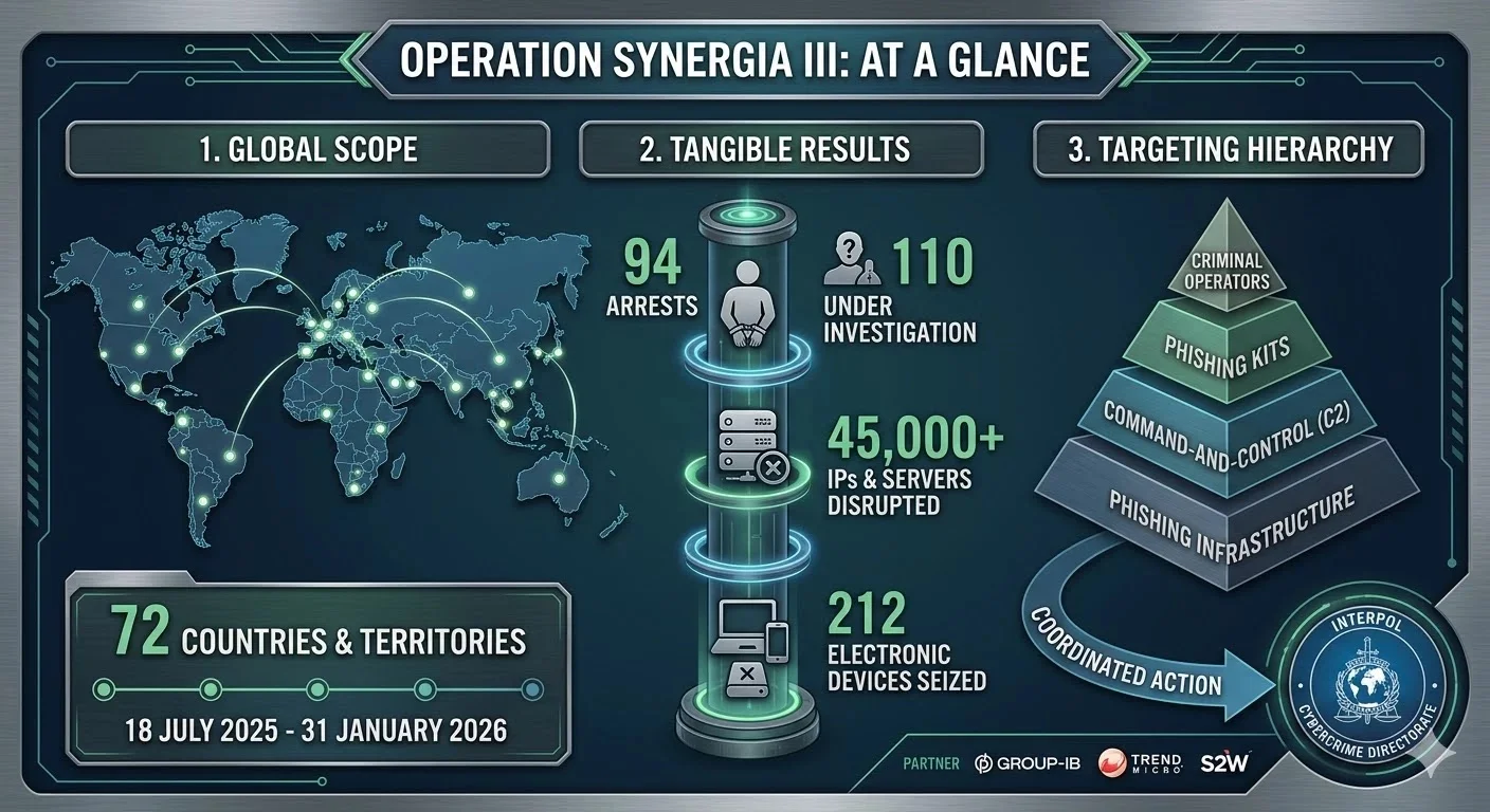 Operation Synergia III, an Interpol-led crackdown spanning July 2025 to January 2026, has disrupted global cybercrime infrastructure across the globe. Authorities across 72 countries sinkholed 45,000 malicious IP addresses and seized 212 devices and servers, resulting in 94 arrests and 110 ongoing investigations.