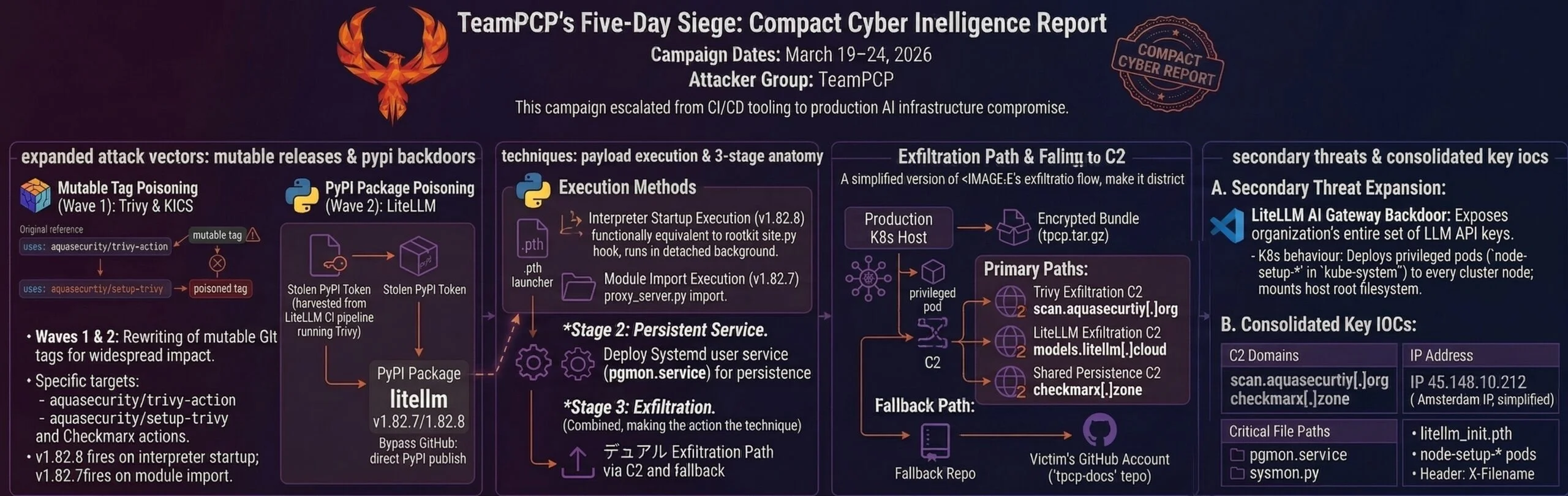 Over the past week, a cloud-focused threat actor called TeamPCP orchestrated a multi-stage, global supply chain campaign, beginning with a compromise of the widely-used Trivy vulnerability scanner. By injecting malicious code into Trivy v0.69.4 and associated GitHub Actions, TeamPCP harvested credentials, SSH keys, cloud tokens, CI/CD secrets, and cryptocurrency wallets. The malware persisted via systemd services and exfiltrated stolen data to typosquatted or attacker-controlled domains.