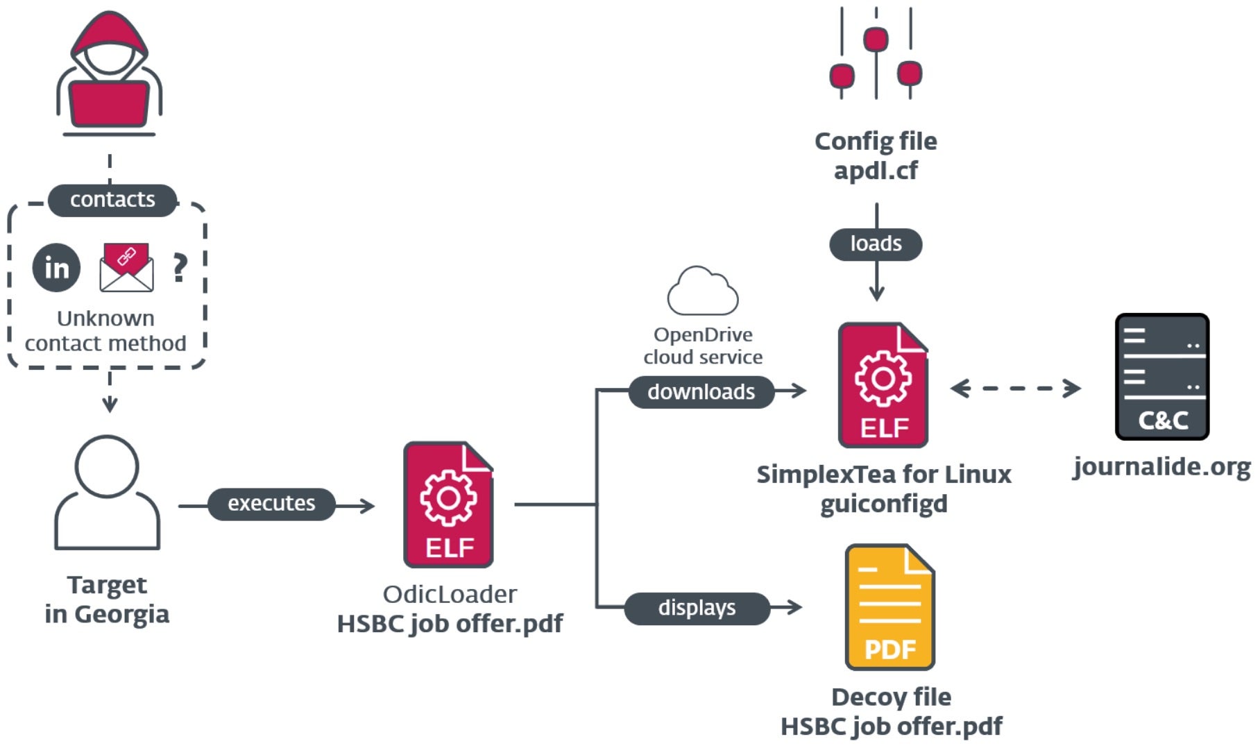After dropping malware on the victim’s device, a ZIP containing a Go-written Linux library is distributed masquerading as a PDF file, prompting victims to double click and launch the “OdicLoader” malware. A second-stage, C++ backdoor called SimplexTea is then launched.
