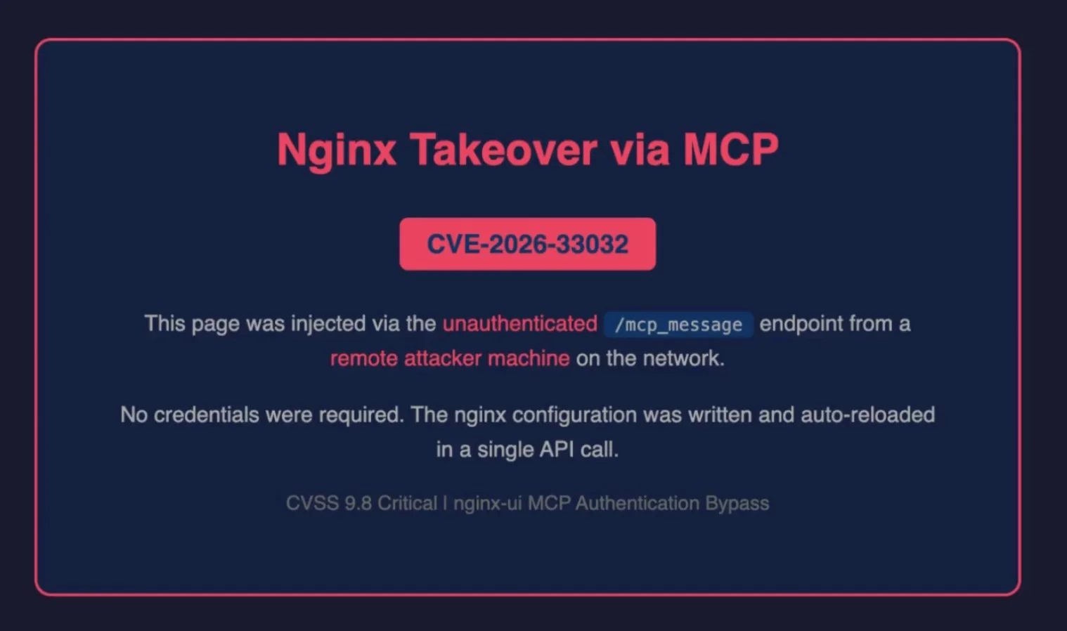 The flaw stems from an exposed /mcp_message endpoint in systems using Model Context Protocol (MCP) support, which fails to enforce proper authentication controls. As a result, remote attackers can invoke privileged MCP functions, including modifying configuration files, restarting services, and forcing automatic reloads to effectively gain complete control over affected Nginx servers.
