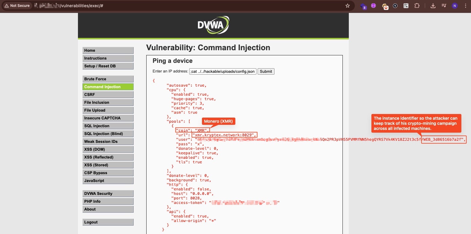 Attackers are leveraging the apps to deploy crypto miners, webshells, and persistence mechanisms. About 20% of found DVMA instances contain malicious artifacts, including XMRig cryptocurrency miners and a self-restoring watchdog.sh script that downloads additional AES-256-encrypted tools and removes competing miners.