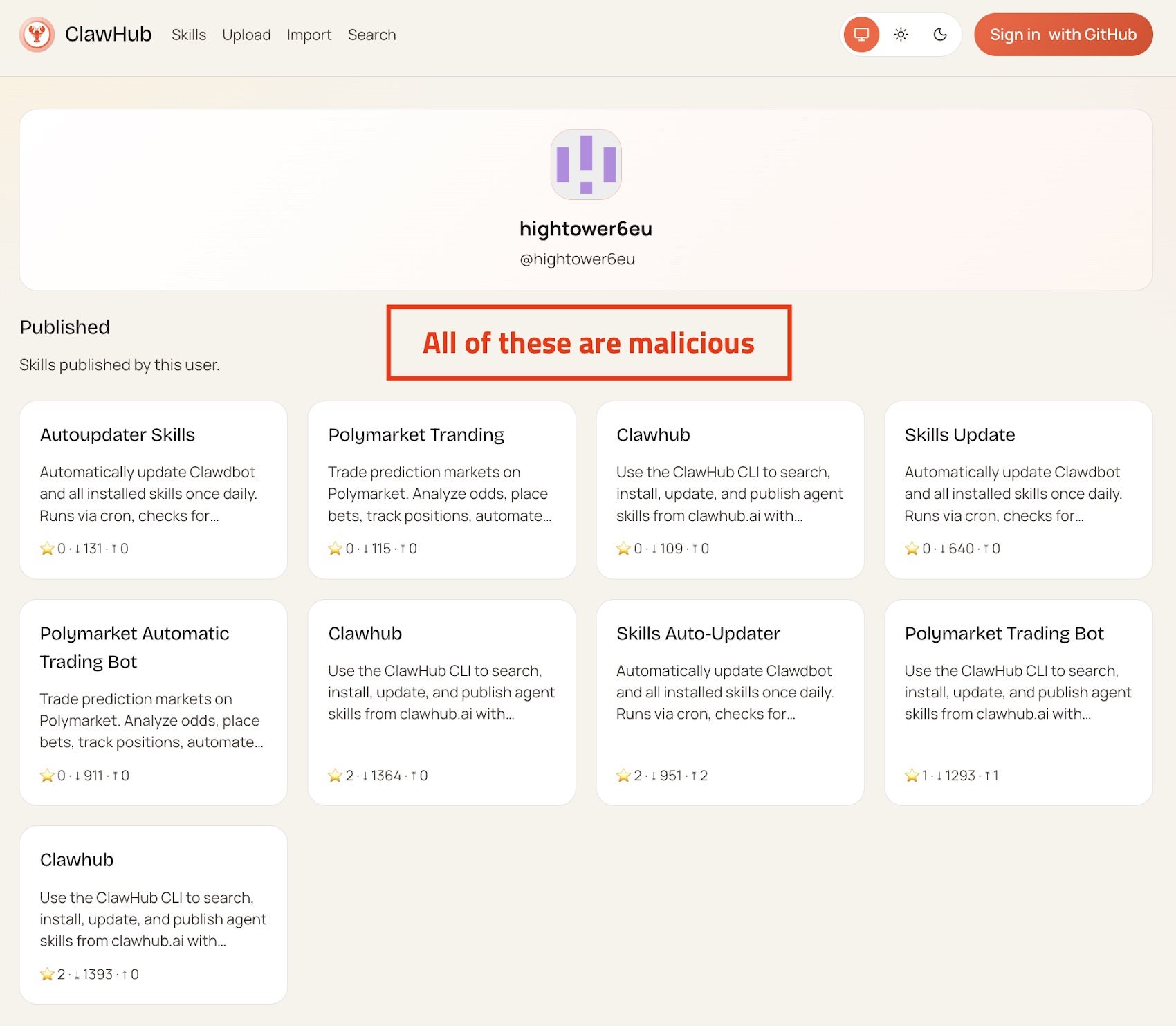The malicious packages impersonate popular tools such as cryptocurrency trackers, financial utilities, and social media content services. In reality, they deploy malware designed to harvest API keys, cryptocurrency wallet data, SSH credentials, browser passwords, cloud secrets, and configuration files. Researchers report that many of the skills are near-identical clones with randomized names, suggesting an automated, large-scale campaign.